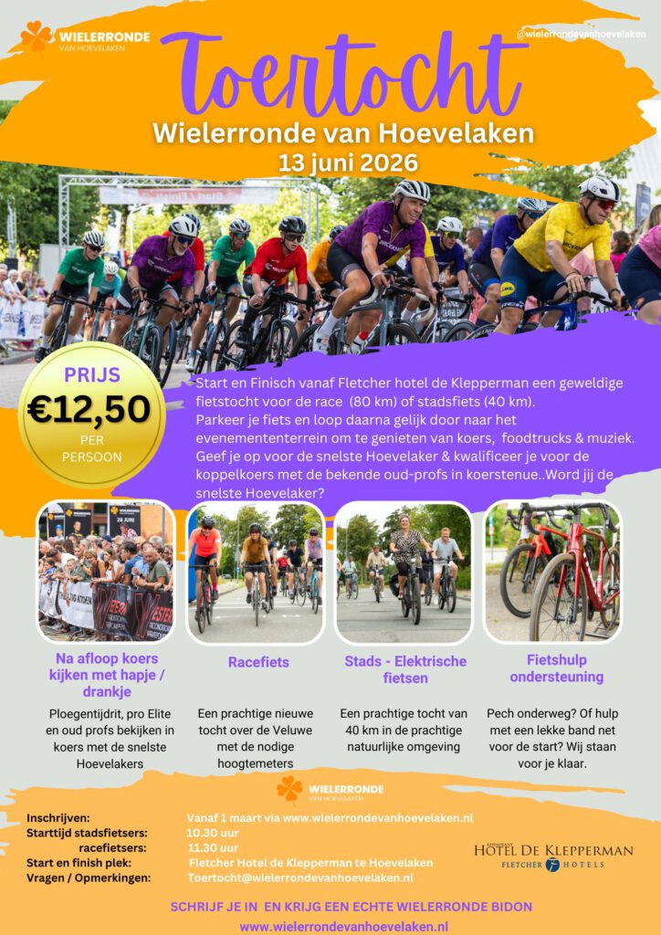Op zaterdag 13 juni 2026 organiseert de Wielerronde van Hoevelaken weer een prachtige toertocht voor jong en oud. De start en finish zijn bij Fletcher Hotel De Klepperman in Hoevelaken.